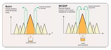 ? ? ? MCSGP工藝,可將含有不純組分的產(chǎn)品回收在一個(gè)封閉的環(huán)內(nèi),進(jìn)行循環(huán)式的層析操作,從而最大限度地提取純產(chǎn)品,使得收率和純度二者兼得。