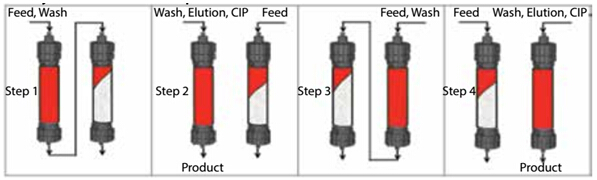? ? ?Capture SMB是將第一根層析柱的抗體/蛋白流穿繼續上樣至第二根層析柱,待第一根層析柱完全滿載后,方結束其上樣進行淋洗,并繼續進行洗脫、再生、再平衡操作,而此時第二根層析柱會獨立進行上樣操作。通過切換柱位操作,保證2根層析柱的洗脫、再生、上樣等操作交替銜接進行,從而實現工藝與系統硬件設計的完美結合,使填料利用率最大化,累積用量大為縮減。