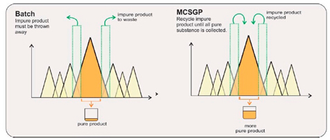 ? ? ?MCSGP工藝,可將含有不純組分的產品回收在一個封閉的環內,進行循環式的層析操作,從而最大限度地提取純產品,使得收率和純度二者兼得。