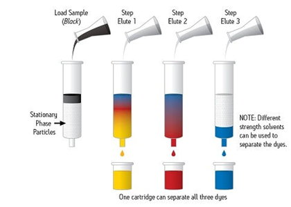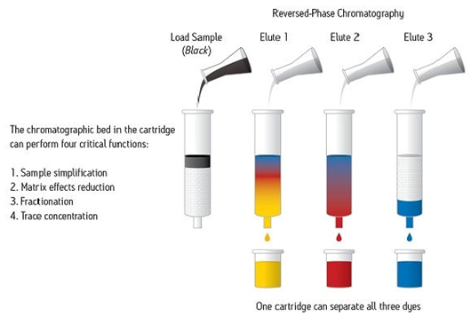SPE通常是一種使用裝在柱芯型裝置內(nèi)的固體顆粒和色譜填充材料對樣品中的不同組分進行化學分離的樣品制備技術(shù)。樣品幾乎始終呈液態(tài),但特殊應(yīng)用項目可能使用氣相中的某些樣品進行。圖1顯示出一份樣品(圖示為黑色)正在使用SPE裝置進行處理,以使組成該樣品的每種染色組分通過色譜分析實現(xiàn)分離。