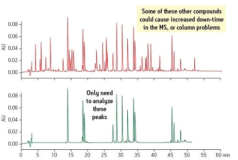 另一種考慮是存在于樣品基質(zhì)中的各種干擾物在每次進樣時可能會蓄積導(dǎo)致儀器停機。如果這些干擾物能在樣品制備期間被除去,那么目標化合物就能使用一種更簡單、更穩(wěn)定的方法進行分析(圖3)。此圖將位于靠上位置的原始樣品與位于靠下位置的經(jīng)SPE制備后的新樣品進行了比較。