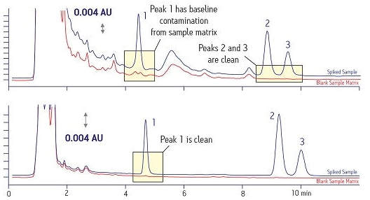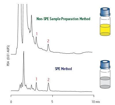 圖5給出了另一個示例。靠上的譜圖表明化合物#1和#2均受到樣品基質(zhì)引起的明顯干擾。靠下的譜圖表明使用SPE進行適當樣品制備后可顯著提高結(jié)果質(zhì)量(基線干凈)。請注意,一條明顯更干凈的基線可提高分析結(jié)果的準確度。如果該樣品需要對化合物進行分離和純化,那么也可以獲得一種純度明顯更高的萃取物。