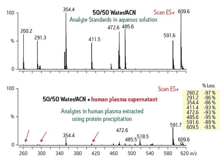 我們可以在圖6中看到這種效應(yīng)。靠上的質(zhì)譜圖代表了目標化合物以生理鹽水作為溶劑進樣時所獲得的信號。靠下的圖譜表明當相同的化合物在人血漿中進行分析時引起信號響應(yīng)顯著降低(抑制比例>90%)。在靠下的圖譜中,只進行了一個常見的蛋白沉淀步驟。這種技術(shù)不能清除可引起離子抑制的基質(zhì)干擾物,從而導(dǎo)致信號響應(yīng)差。