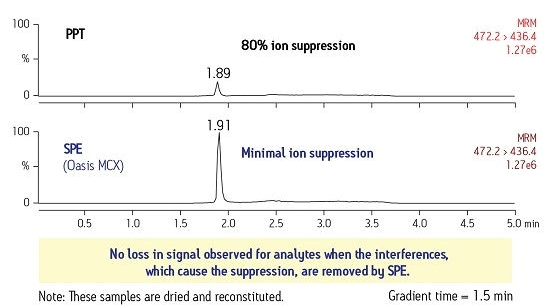 在有些情況下,源自樣品基質(zhì)的干擾物可能會增加某種化合物的信號,這叫做離子增強,可導(dǎo)致響應(yīng)值偏高。適當?shù)腟PE方法可通過將干擾物與該化合物分離開來而最大限度減弱這種效應(yīng),從而使響應(yīng)值更準確。