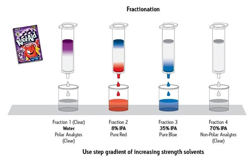 圖8給出了關(guān)于SPE分餾效力的一個示例。在這里,一種復(fù)雜的干粉樣品(紫葡萄混合飲品)被輕易分離成4種餾分:1種完全由極性化合物組成的餾分、1種純化型紅色化合物、1種純化型藍色化合物和1種包含所有其余非極性化合物的餾分。