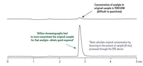 分析環(huán)境樣品中的痕量污染物或者代謝物在生物液體內(nèi)隨時間的變化情況就是一個可以說明這一點的較好例子。圖9中靠上的圖譜表明使用原始純樣品進行分析時,目標化合物的信號響應(yīng)差。通過以SPE作為痕量濃縮策略制備樣品后再使用相同的分析條件進行分析后所獲得的靠下的圖譜表明這種化合物的信號強度顯著提高。根據(jù)這一結(jié)果,我們可以準確計算出純樣品中的原始化合物濃度。