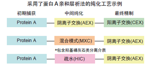 ??? 采用蛋白A親和層析法的純化工藝是指第一步捕獲使用蛋白A親和層析,其后步驟使用其他層析模式去除諸如宿主細胞蛋白、核酸、抗體多聚體和脫落的蛋白A配體等雜質(zhì)的方法。工藝中如果選用陰離子交換層析法(包括陰離子交換膜層析法),則是通過目標抗體流穿或吸附并去除雜質(zhì)而達到純化抗體的目的。