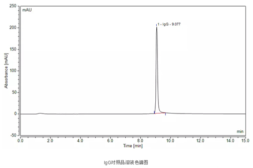 分析結果表明,IgG與前面雜質峰的分離度Rs為18.99,兩次進樣測定結果的算數平均差值與算術平值比值為0.26%,完全滿足國標中規定的檢測要求。