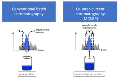 圖1. 傳統(tǒng)單柱層析(左):重疊組分被舍棄;MCSGP(右):重疊組分被在線(xiàn)回收,再次純化。