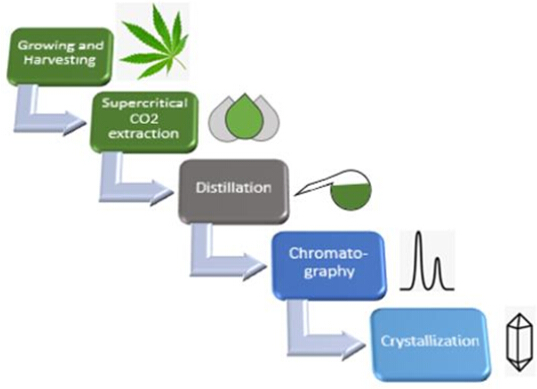 在大麻二酚(CBD)的生產(chǎn)中,THC及其它植物性雜質(zhì)(如蠟質(zhì)和色素)很難去除,需要經(jīng)過(guò)一系列的預(yù)處理和純化步驟,才能從大麻中提取獲得高純度、低THC含量的CBD產(chǎn)品。