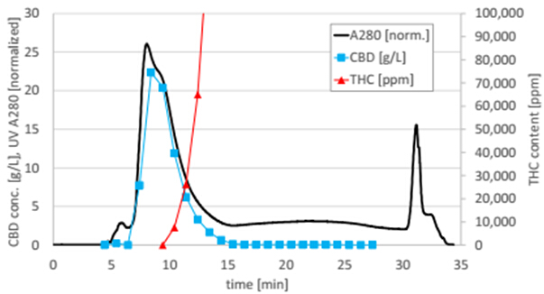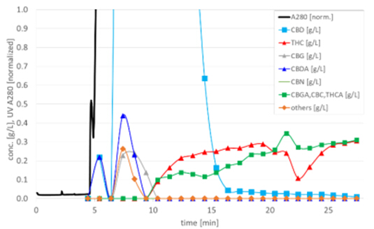 圖4. C18純化CBD過(guò)程圖譜,顯示UV280 nm、CBD濃度、THC含量(THC含量在10min左右開(kāi)始顯著升高)