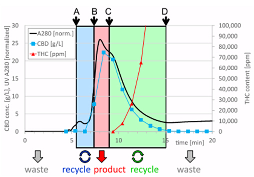 A:CBD濃度2.7 g/L(2,000 mAU)時(shí)開(kāi)始進(jìn)行回收(recycle);