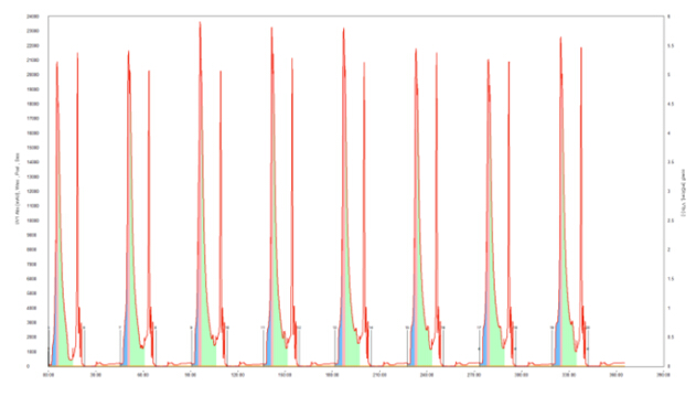 圖9各cycle重疊性良好,表明MCSGP功能運(yùn)行穩(wěn)定,各cycle的產(chǎn)率、產(chǎn)品濃度及純度均保持穩(wěn)定。保留時(shí)間和峰形的變化由MControl自動(dòng)補(bǔ)償,MControl根據(jù)紫外線(xiàn)閾值啟動(dòng)CBD收集,當(dāng)紫外值降低至最大峰值90%時(shí)結(jié)束收集。