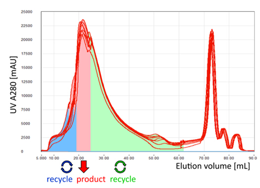 采用MCSGP,可將含有不純組分的產(chǎn)品回收再純化, 進(jìn)行循環(huán)式的層析操作,從而最大限度地提純產(chǎn)品, 使得純度和收率二者兼得。