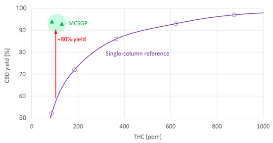 圖11為單柱層析與MCSGP收率對(duì)比圖。已規(guī)定最大THC含量為100 ppm,在這一水平,單柱層析的CBD收率僅為52%,而MCSGP的CBD收率為94%,比單柱層析高出80%。
