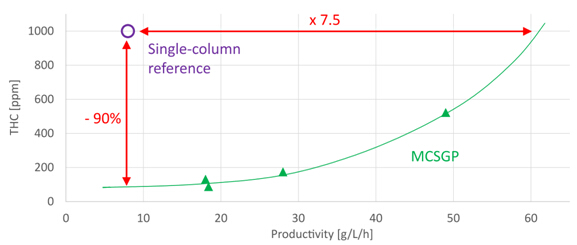 MCSGP可用于不同工藝要求。如果對(duì)目標(biāo)產(chǎn)品的純度要求并不高,采用MCSGP可使產(chǎn)率進(jìn)一步提高。比如某企業(yè)要求THC含量上限為1000 ppm時(shí),收率水平不得低于85%,用MCSGP代替單柱層析后,產(chǎn)率由原來(lái)的8 g/L/h提高到了60 g/L/h以上。而另一工藝情況為,當(dāng)從單柱層析轉(zhuǎn)換為MCSGP時(shí),保持產(chǎn)率不變,雜質(zhì)THC含量可從1000 ppm降低至100 ppm。見(jiàn)圖12純度 - 產(chǎn)率曲線(xiàn)。