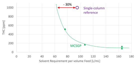 圖13顯示了單柱層析和MCSGP的溶劑消耗對(duì)比。在要求THC最大含量為1000 ppm時(shí),MCSGP可使溶劑消耗量降低30%。單柱層析的溶劑消耗量為每mL上樣樣品消耗95 mL溶劑,而MCSGP的溶劑消耗量?jī)H為每mL上樣樣品消耗65 mL溶劑。