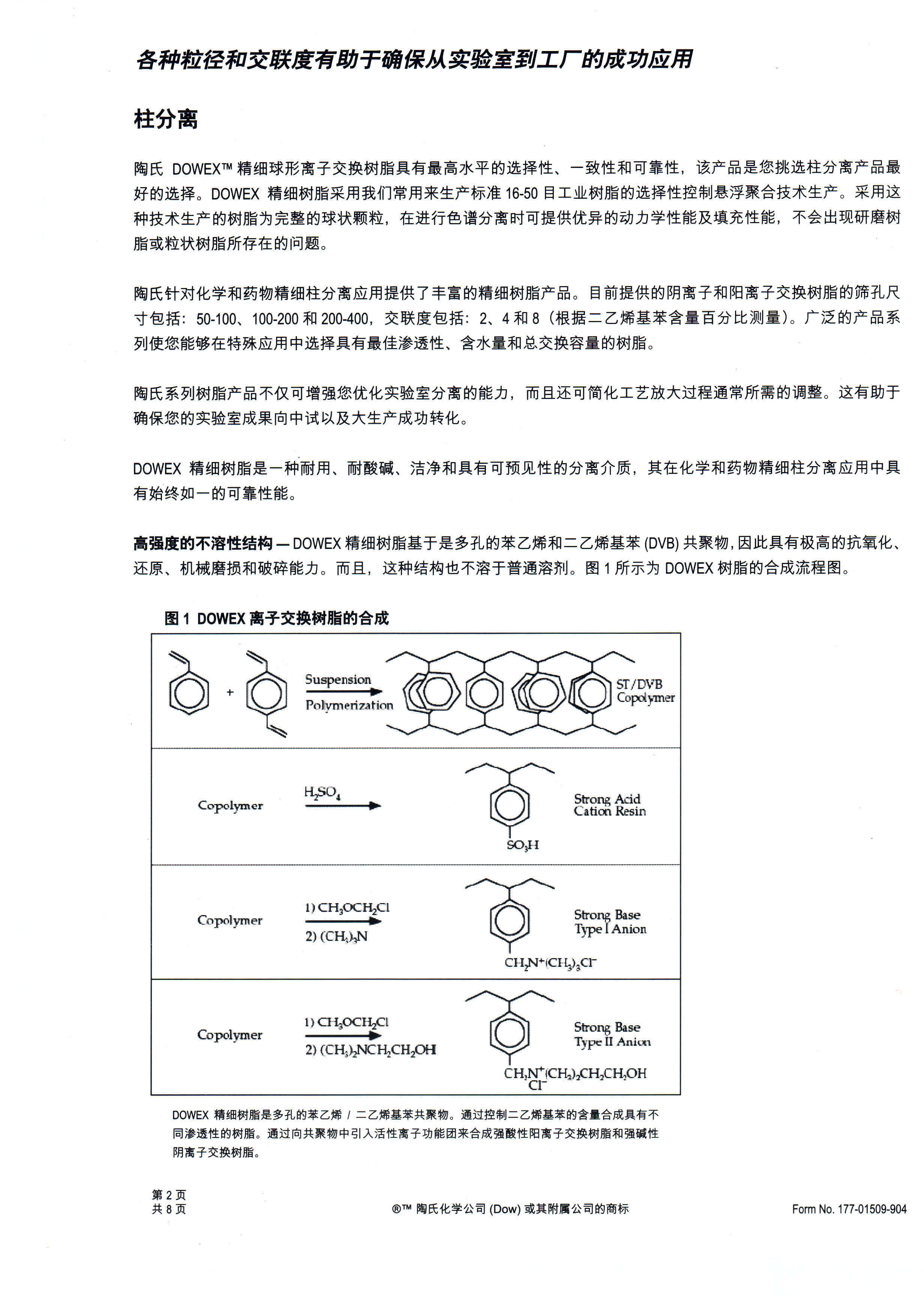 ?????? DOWEX系列離子交換色譜分離樹脂的骨架材料均為苯乙烯-二乙烯苯,采用特殊的懸浮聚合工藝大規模制備而得,具有良好的化學、物理穩定性。易裝柱,目標組份擴散阻力小,產品質量穩定。因此,DOWEX系列離子交換色譜分離樹脂不僅可以滿足實驗室食品、藥品等精細化工產品的小試工藝開發,也使得工藝的放大更為輕松。