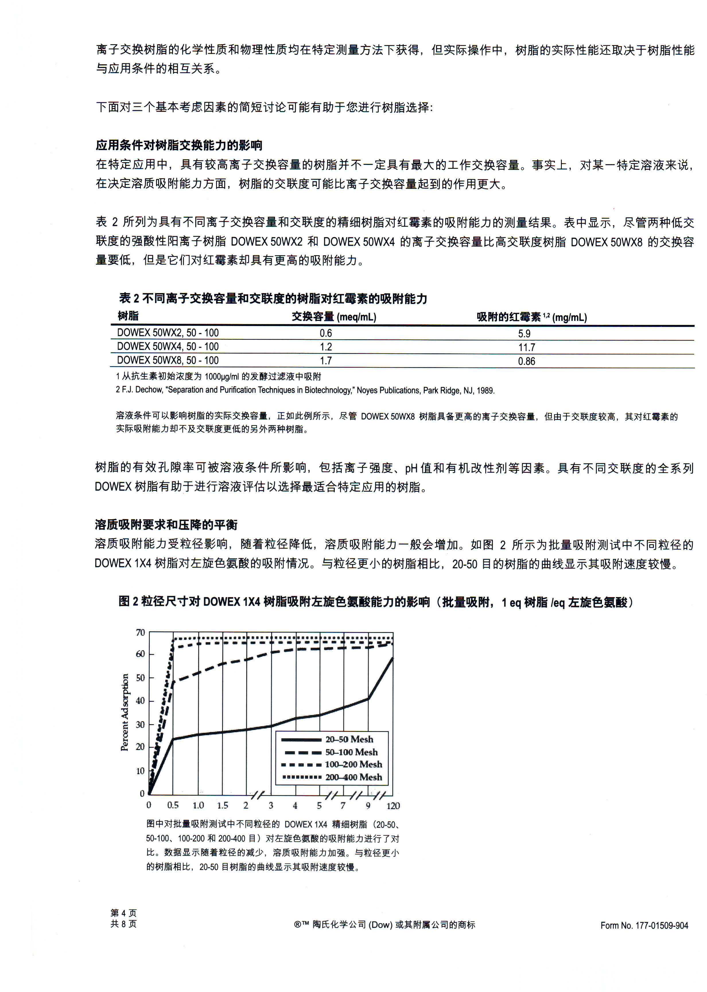 ?????? DOWEX系列離子交換色譜分離樹脂有強酸性陽離子交換樹脂和強堿性陰離子交換樹脂兩大類,每一類又根據交聯度(即DVB%)的不同劃分為3個小類,分別以“×2” “×4”“×8”表示,在此基礎上進一步提供3個粒度范圍可供選擇,即150-300μm50-100目)、75-150μm100-200目)以及35-75μm200-400目),共計18個樹脂牌號。顯然,不同交聯度的樹脂含水量不一,體積交換量、物質擴散的阻力各異,如此寬泛的產品范圍豐富了客戶的試用選擇,可以針對具體的應用優選出適宜的色譜分離樹脂。