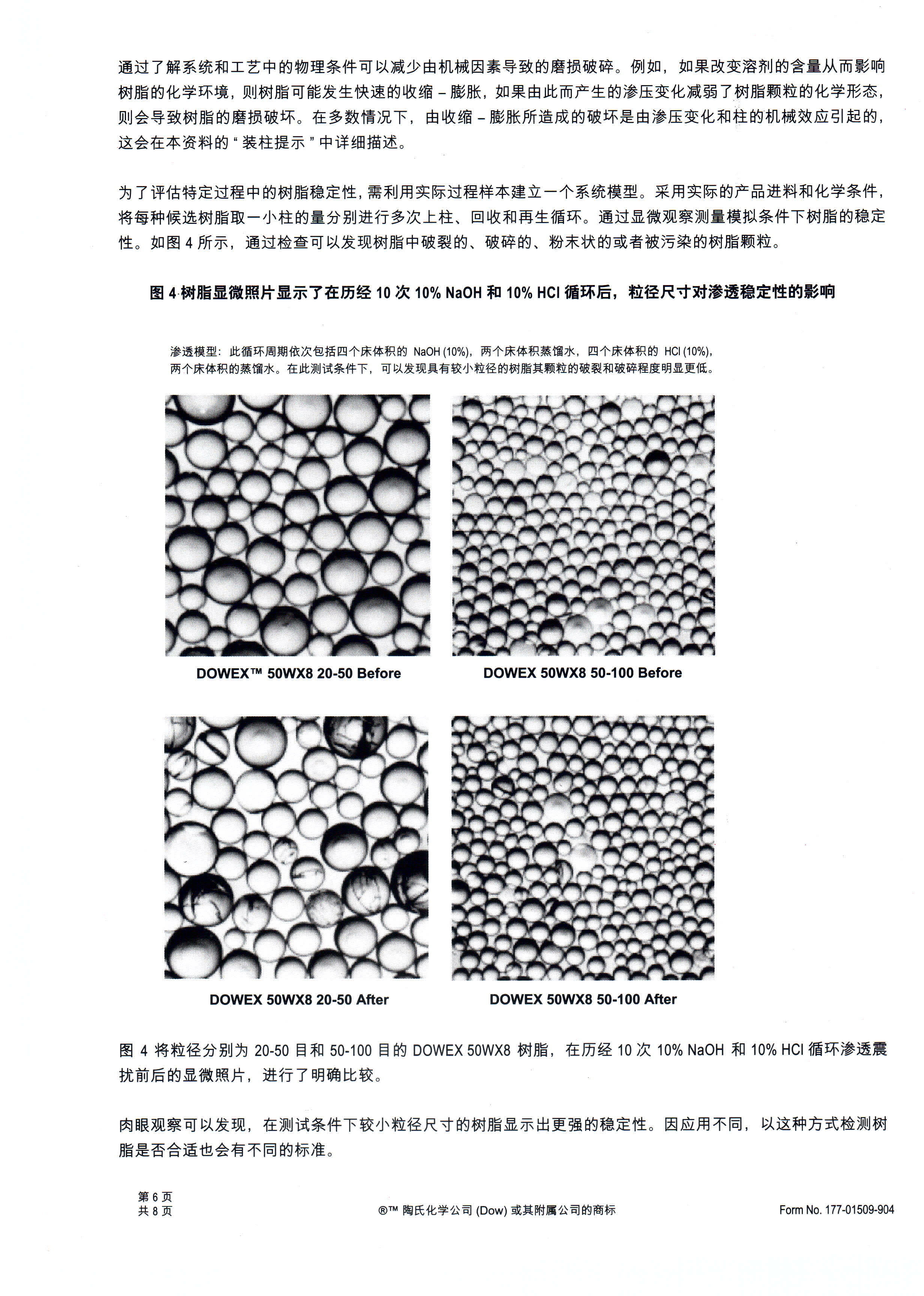 DOWEX精細樹脂采用陶氏生產標準16-50目工業樹脂所使用的選擇性控制懸浮聚合技術。采用這種技術生產的樹脂更為完整、均一,具有最高水平的選擇性、一致性和可靠性,因此,在進行色譜分離時可提供優異的動力學性能及填充性能,不會出現研磨樹脂或粒狀樹脂所存在的問題。通過控制懸浮聚合制造工藝,可以嚴格控制DOWEX精細樹脂的粒徑,避免處理干樹脂時因超細顆粒而易產生灰塵,避免作為色譜介質或助濾劑使用時細顆粒堵塞篩板或過濾器而延長批處理的裝填時間,造成物理損耗和樹脂的損耗。