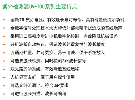 檢測器指能檢測色譜柱流出組分及其量的變化的器件。對檢測器的要求是:靈敏度高,線性范圍寬,重現性好,穩定性好,響應速度快,對不同物質的響應有規律性及可預測性。QuikSep UV全波長檢測器可設置2個波長同時檢測!
