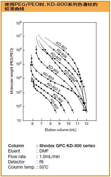GPC KD-805是標準的油溶性SEC色譜柱,適用于從低分子量到高分子量的寬范圍的樣品。流動相是DMF。