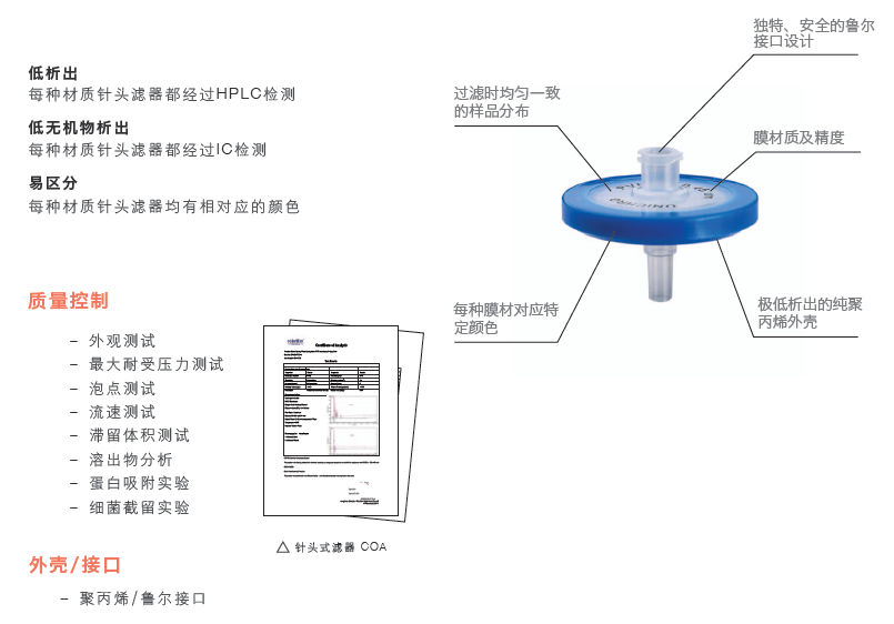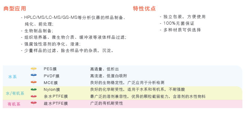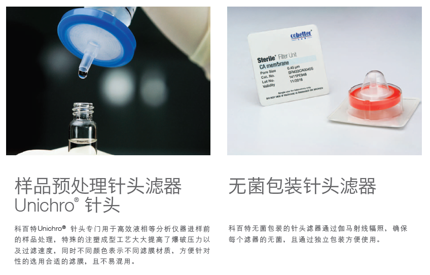 科百特針式過濾器采用PES/PCDF/Nylon/親水PTFE/GF等濾材,以過濾不同性質的物料,設計采用超聲波焊接技術,減少使用時從側面漏液的風險,同時每個針頭根據膜材質的不同而采用不同顏色標注,為您提供高效、快速的過濾選擇!