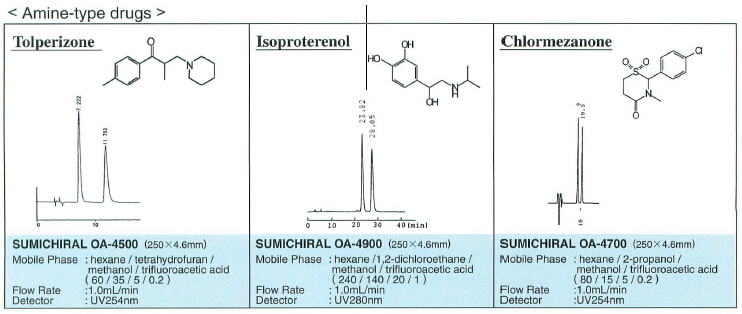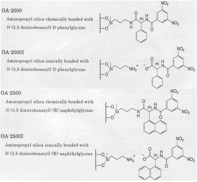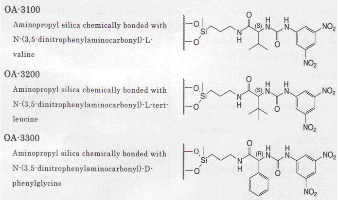 Pirkle型手性柱是將氨基酸的3,5-二硝基苯?;苌镒鳛槭中赃x擇劑,改良型是將萘乙二胺二鹽酸鹽作為手性選擇劑。主要通過電荷移動和氫結(jié)合相互作用來識別手性。OA-2500或OA-3300可有效分離含有-COOH的手性化合物。采用將氨基酸的N位進(jìn)行NBD標(biāo)記的方法,用于D型氨基酸的微量分析。此外,OA-4000系列在胺類系醫(yī)藥品、酒精類、酯、氫胺等眾多化合物正相直接分離方面發(fā)揮了優(yōu)越的性能。